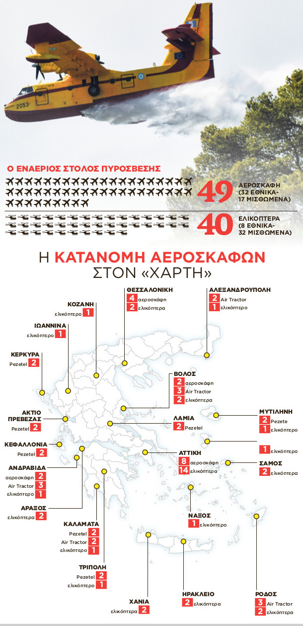 Τη φετινή αντιπυρική περίοδο ο εναέριος στόλος πυρόσβεσης είναι 89 πτητικά μέσα. Από αυτά τα 49 είναι αεροσκάφη (32 εθνικά-17 μισθωμένα) και 40 ελικόπτερα (8 εθνικά-32 μισθωμένα). Αυτό που έχει σημασία είναι η διασπορά τους σε όλα τα αεροδρόμια της χώρας της κατανομής αλλά και ανακατανομής τους όταν αλλάζουν τα μετεωρολογικά δεδομένα και, κυρίως, η ένταση των ανέμων και οι θερμοκρασίες.