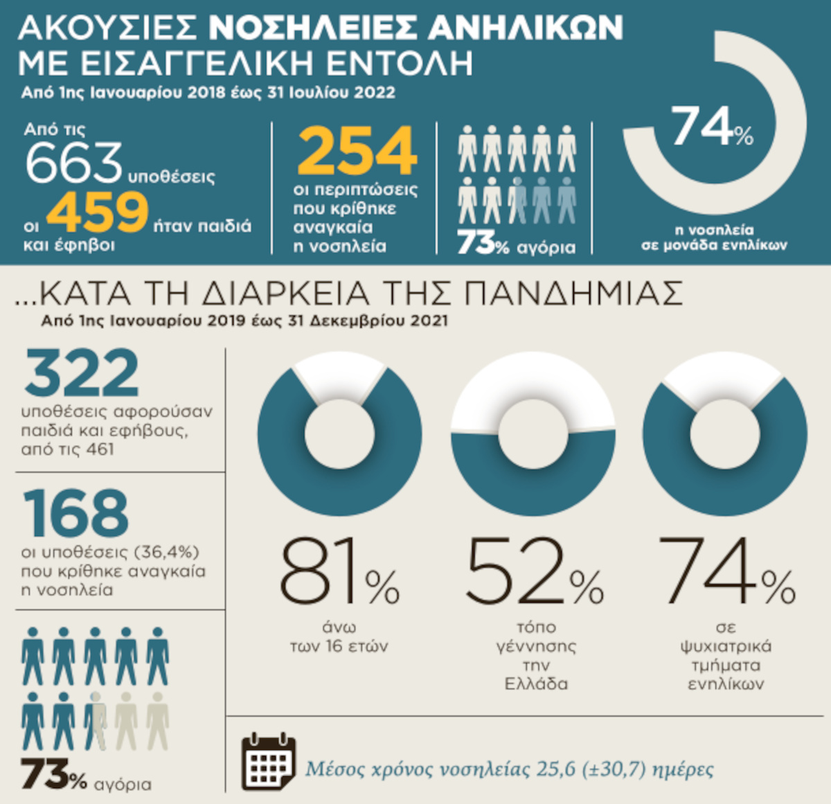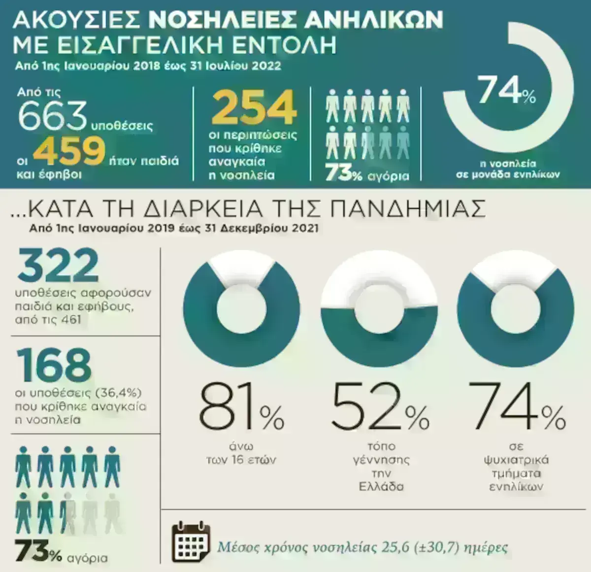 Σύμφωνα με τα στοιχεία, από 1ης Ιανουαρίου 2019 έως 31 Δεκεμβρίου 2021, διάστημα που περιλαμβάνει τα μεγάλα lockdown που ταλαιπώρησαν τους κατοίκους της χώρας μας και κράτησαν τα σχολεία κλειστά, η Εισαγγελία Ανηλίκων ασχολήθηκε με 663 υποθέσεις ακούσιας νοσηλείας, οι 459 εκ οποίων ήταν παιδιά και έφηβοι, ενώ μόνο 254 περιπτώσεις παρέμειναν σε ψυχιατρική δομή για νοσηλεία.