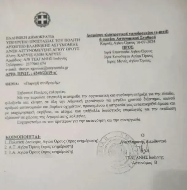Την εκτέλεση των αποφάσεων τώρα ανέλαβε δικαστικός επιμελητής και σε αυτές αναφέρεται το έγγραφο της Αστυνομικής Διεύθυνσης Αγίου Όρους με το οποίο ζητείται συνδρομή «προκειμένου η υπηρεσία μας ανταποκριθεί άμεσα και με επιχειρησιακή ακρίβεια σε αίτημα που υπέβαλλε δικαστικός επιμελητής για την εκτέλεση εξώσεων σε χώρους της Αγιορείτικης πολιτείας», όπως ακριβώς αναφέρεται στο έγγραφο.