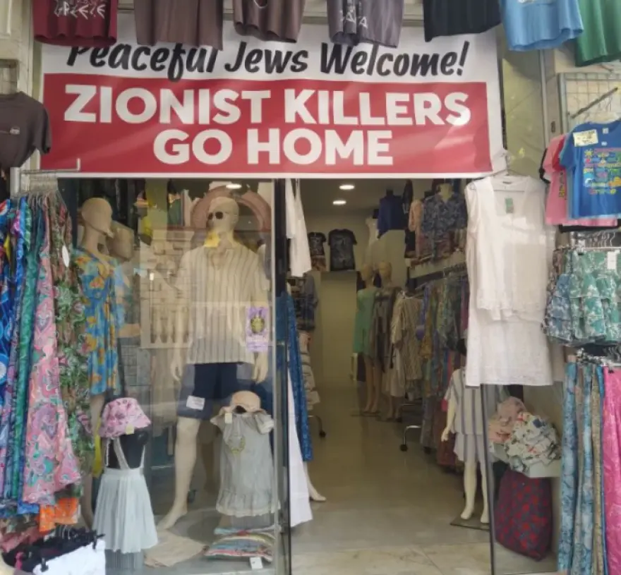 Το πανό που ενόχλησε τον τουρίστα ανέγραφε:«Peaceful Jews welcome – Zionist killers go home», δηλαδή «Καλωσορίζουμε τους ειρηνικούς Εβραίους – Σιωνιστές δολοφόνοι, πηγαίνετε σπίτια σας».