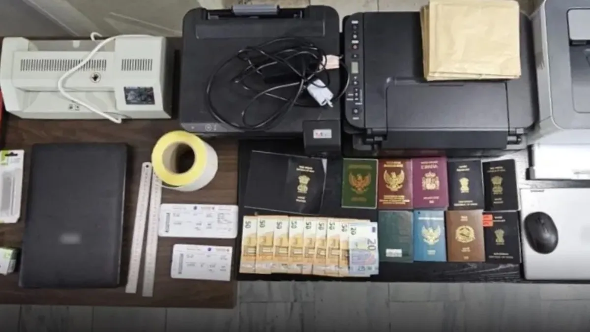 • εξοπλισμός κατάρτισης πλαστών εγγράφων (πλαστικοποιητής, 3 εκτυπωτές, σαρωτής, γραφική ύλη, φακός υπέρυθρου φωτός και ύφασμα εξωφύλλου διαβατηρίων)