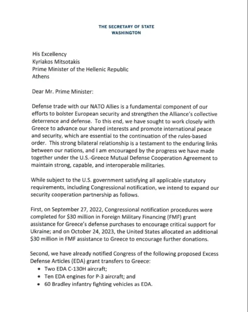 Συγκεκριμένα, ο υπουργός γράφει πως το Στέιτ Ντιπάρτμεντ έχει ήδη ενημερώσει το Κογκρέσο για τις ακόλουθες προτεινόμενες μεταφορές επιχορηγήσεων υπέρβασης αμυντικών ειδών (EDA) προς την Ελλάδα: