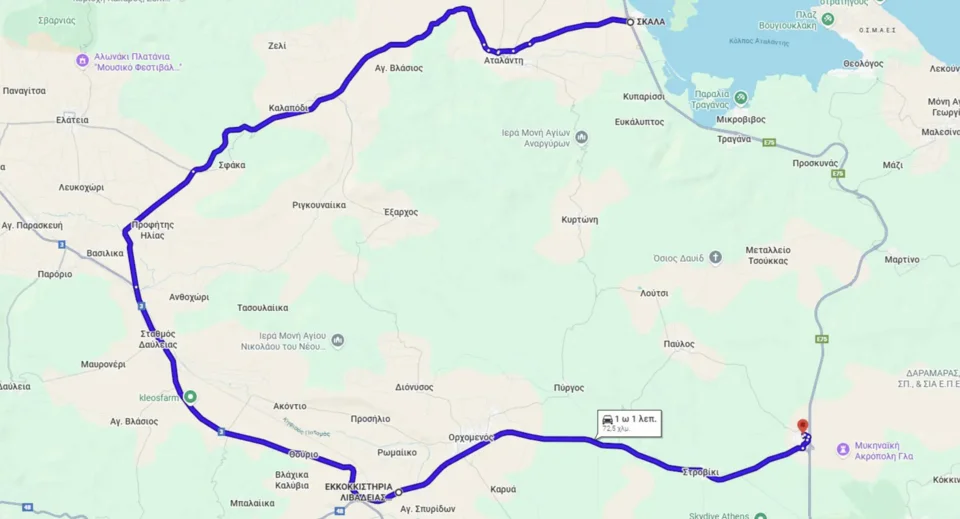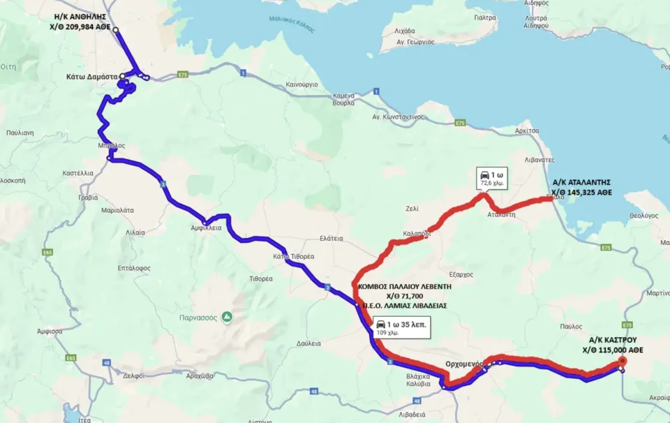 1) έξοδος από τον Αυτοκινητόδρομο στον Η/Κ Ανθήλης και κινούμενοι μέσω Μπράλου, Αμφίκλειας, Κάτω Τιθορέας, Ορχομενού να εισέρχονται στον Α/Κ Κάστρου (επισυνάπτεται σχετική οπτική απεικόνιση)