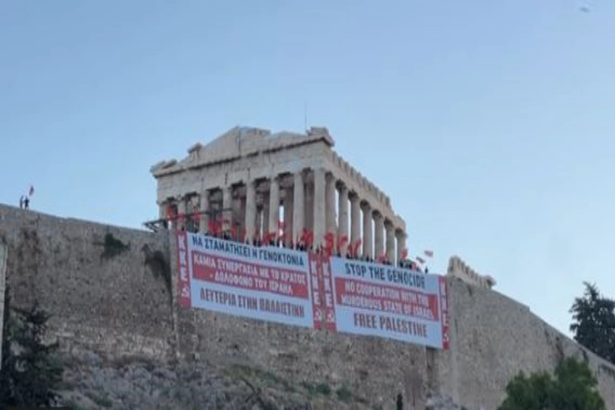 Με μια συντονισμένη κινητοποίηση, νωρίς το πρωί, μέλη του ΚΚΕ και της ΚΝΕ ανέβηκαν στην Ακρόπολη και σήκωσαν δυο πανό προς την πλευρά της Διονυσίου Αρεοπαγίτου, γραμμένα στα ελληνικά και στα αγγλικά: «Να σταματήσει η γενοκτονία. Καμία συνεργασία με το κράτος δολοφόνο του Ισραήλ. Λευτεριά στην Παλαιστίνη».