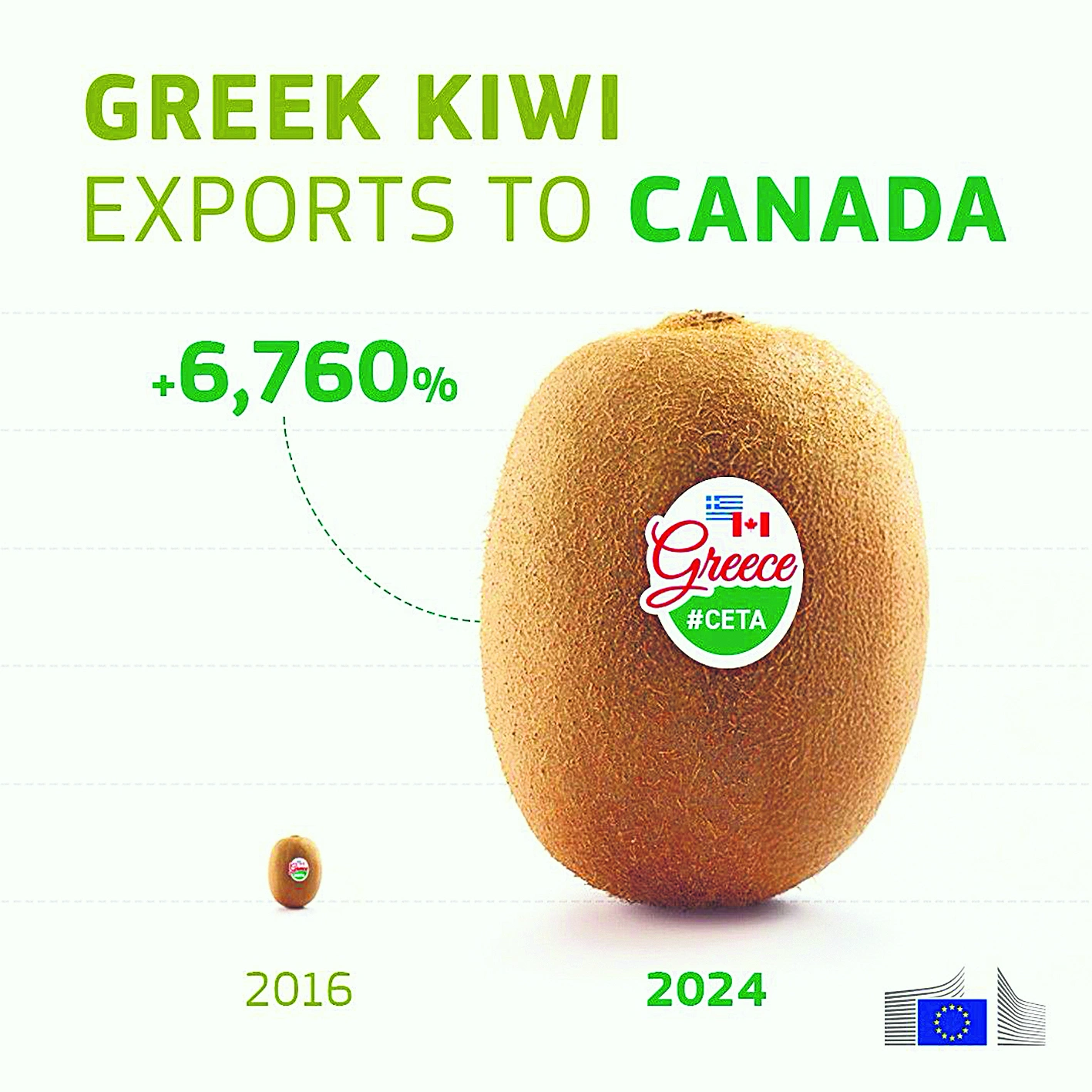 Η εντυπωσιακή άνοδος αποδίδεται, μεταξύ άλλων, στα οφέλη της προσωρινής εφαρμογής της CETA (Comprehensive Economic and Trade Agreement), δηλαδή της Περιεκτικής Οικονομικής και Εμπορικής Συμφωνίας μεταξύ Ευρωπαϊκής Ενωσης και Καναδά. Η CETA, η οποία υπογράφηκε το 2016 και εφαρμόζεται προσωρινά από το 2017, έχει διευκολύνει σημαντικά την εμπορική ροή αγαθών, καταργώντας περίπου το 98% των δασμών και ανοίγοντας νέες αγορές για τα ευρωπαϊκά προϊόντα, μεταξύ αυτών και το ελληνικό ακτινίδιο.