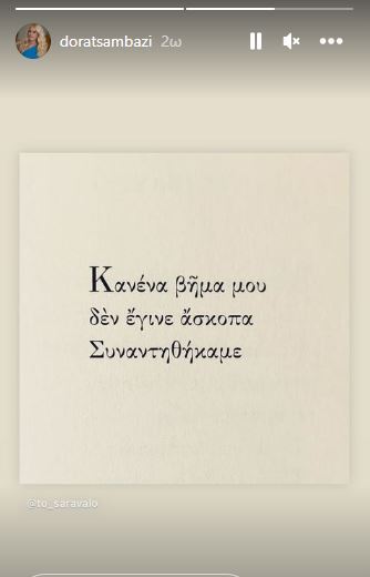 «Κανένα βήμα μου δεν έγινε άσκοπα. Συναντηθήκαμε», έγραψε σε στόρι. Η σύζυγος και μητέρα των δύο παιδιών του, Δώρα Τσαμπαζή, ήταν στο πλευρό του Αλέξανδρου Νικολαΐδη σε όλο το διάστημα της δοκιμασίας του και της μάχης του με την ασθένειά του.