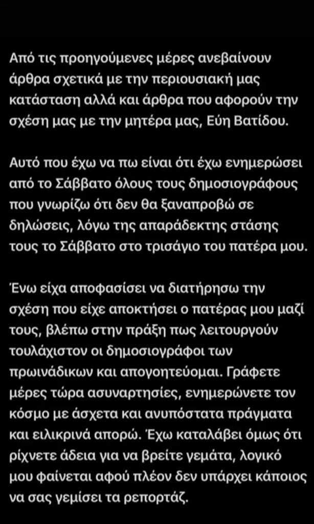 «Ενώ είχα αποφασίσει να διατηρήσω την σχέση που είχε αποκτήσει ο πατέρας μου μαζί τους, βλέπω στην πράξη πώς λειτουργούν τουλάχιστον οι δημοσιογράφοι των πρωινάδικων και απογοητεύομαι. Γράφετε μέρες τώρα ασυναρτησίες, ενημερώνετε τον κόσμο με άσχετα και ανυπόστατα πράγματα και ειλικρινά απορώ.