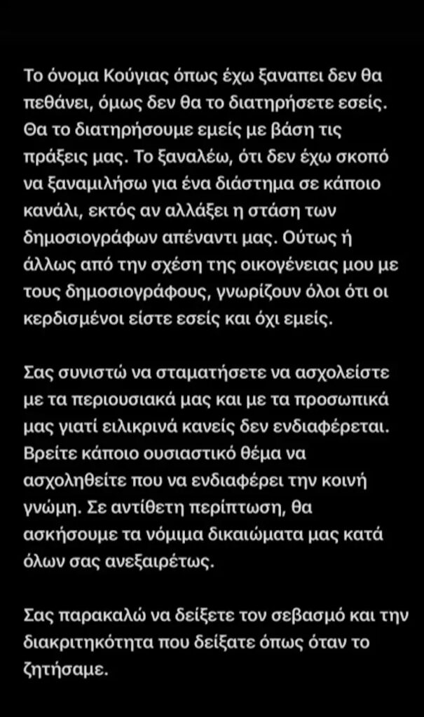 «Σας συνιστώ να σταματήσετε να ασχολείστε με τα περιουσιακά μας και με τα προσωπικά μας γιατί ειλικρινά κανείς δεν ενδιαφέρεται. Βρείτε κάποιο ουσιαστικό θέμα να ασχοληθείτε που να ενδιαφέρει την κοινή γνώμη. Σε αντίθετη περίπτωση, θα ασκήσουμε τα νόμιμα δικαιώματά μας κατά όλων σας ανεξαιρέτως. Σας παρακαλώ να δείξετε τον σεβασμό και την διακριτικότητα που δείξατε όπως όταν το ζητήσαμε» έγραψε ο Χρίστος Κούγιας.