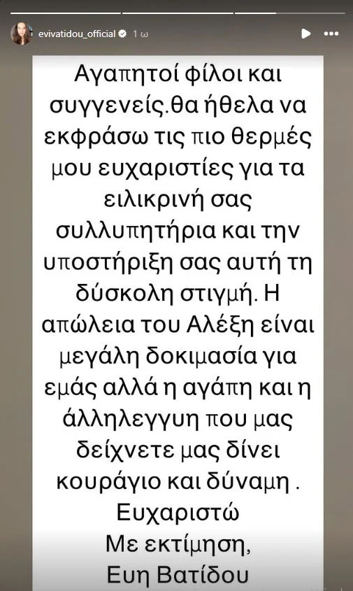 «Αγαπητοί φίλοι και συγγενείς, Θα ήθελα να εκφράσω τις πιο θερμές μου ευχαριστίες για τα ειλικρινή σας συλλυπητήρια και την υποστήριξή σας. Η απώλεια του Αλέξη είναι μεγάλη δοκιμασία για εμάς, αλλά η αγάπη και η αλληλεγγύη που μας δείχνετε μάς δίνει κουράγιο και δύναμη. Ευχαριστώ. Με εκτίμηση, Εύη Βατίδου», έγραψε χαρακτηριστικά.