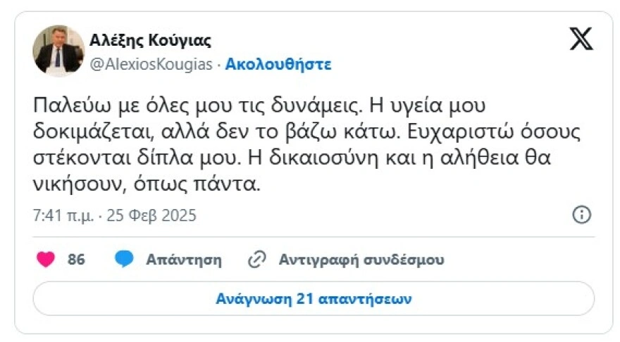 «Παλεύω με όλες μου τις δυνάμεις. Η υγεία μου δοκιμάζεται, αλλά δεν το βάζω κάτω. Ευχαριστώ όσους στέκονται δίπλα μου. Η δικαιοσύνη και η αλήθεια θα νικήσουν, όπως πάντα» υποτίθεται ότι είχε γράψει ο Αλέξης Κούγιας, με τους δικούς του ανθρώπους να διευκρινίζουν ότι ο 75χρονος ποινικολόγος δεν έχει social media.