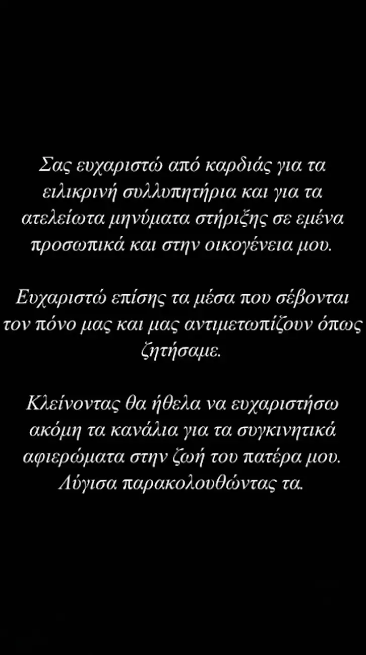 Ο Χρίστος Κούγιας έγραψε στο νέο του μήνυμα: «Σας ευχαριστώ από καρδιάς για τα ειλικρινή συλλυπητήρια και για τα ατελείωτα μηνύματα στήριξης σε εμένα προσωπικά και στην οικογένειά μου. Ευχαριστώ επίσης τα Μέσα που σέβονται τον πόνο μας και μας αντιμετωπίζουν όπως ζητήσαμε».