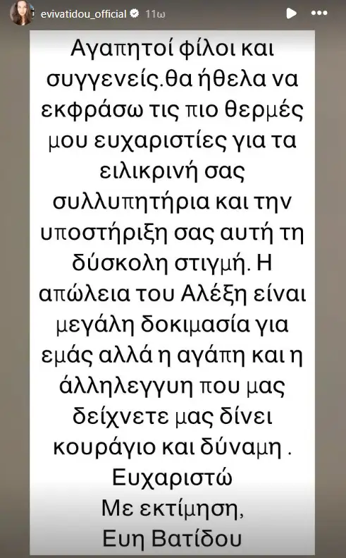 Η απώλεια του Αλέξη είναι μεγάλη δοκιμασία για εμάς, αλλά η αγάπη και η αλληλεγγύη που μας δείχνετε μας δίνει κουράγιο και δύναμη. Ευχαριστώ. Με εκτίμηση, Εύη Βατίδου».