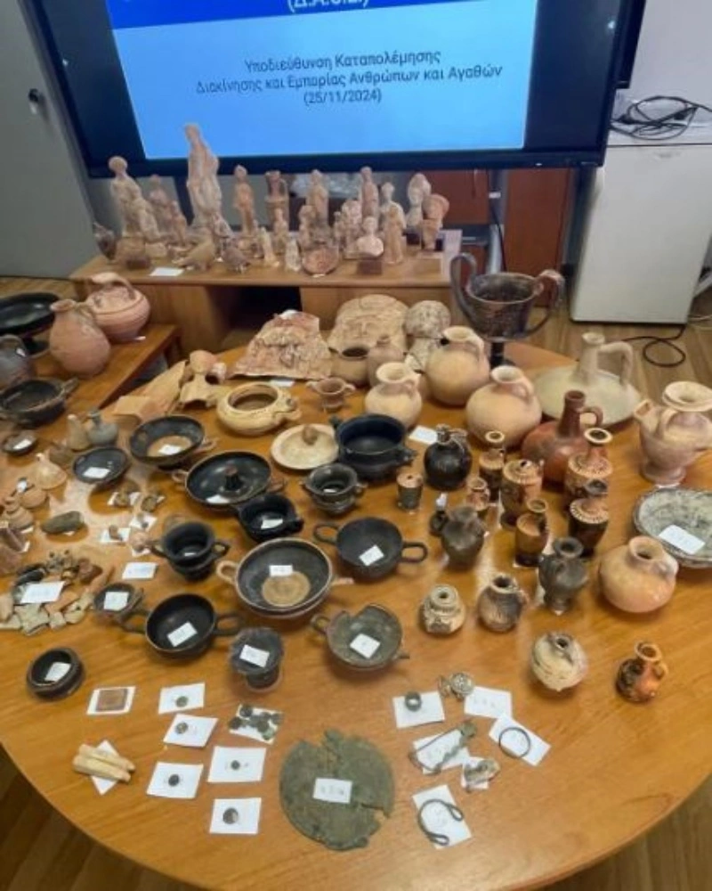 Όπως αναφέρει η ανακοίνωση της ΕΛΑΣ, ενδεικτικά, κατασχέθηκαν κύλικες, φιαλίδια, λήκυθοι, πήλινα ειδώλια και ομοιώματα, πρόχοι, μικρογραφικοί σκύφοι αρχαϊκής και κλασικής/ελληνιστικής περιόδου, πήλινοι λύχνοι ρωμαϊκών/βυζαντινών χρόνων, χάλκινα και αργυρά νομίσματα, καθώς και θραύσματα κεραμικής.