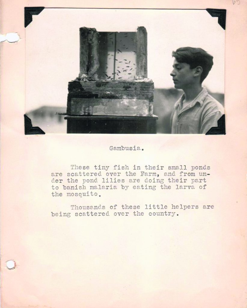 «Ο τότε διευθυντής της Σχολή, Dr Charlie House, έδειξε έντονο ενδιαφέρον για ένα είδος ψαριού (Gambusia) που είχε αποδειχτεί αποτελεσματικό κατά της φυματίωσης. Το μικρό αυτό ψάρι τρώει τις νύμφες του κουνουπιού. Ο Δημήτριος Γεωργιάδης, μέλος του προσωπικού της Γεωργικής Σχολής, στάλθηκε στη Ρώμη για να φέρει το ψάρι στην Ελλάδα. Ανάμεσα σε άλλα μέρη, τα ψάρια τοποθετήθηκαν και σε μια δεξαμενή που περιέβαλλε το κτήριο James Hall. Το 1924 εξαπολύθηκε εντατική εκστρατεία για την καταπολέμηση της ελονοσίας στο χώρο των εγκαταστάσεων της Σχολής. Χρησιμοποιήθηκαν ταυτόχρονα πολλές μέθοδοι όπως: το ράντισμα των αυλακιών με πετρέλαιο, η τοποθέτηση του ψαριού Gambusia, σήτες στα παράθυρα ενώ χορηγήθηκαν γενναίες δόσεις κινίνης. Χρειάστηκαν ακόμη δύο ολόκληρες δεκαετίες για να εξαλειφθεί η ελονοσία από την περιοχή, όμως οι στατιστικές της Γεωργικής Σχολής φανερώνουν μια φθίνουσα πορεία από τη δεκαετία του ’20. Τα αποτελέσματα ήταν εντυπωσιακά», είπε από το βήμα του συνεδρίου.