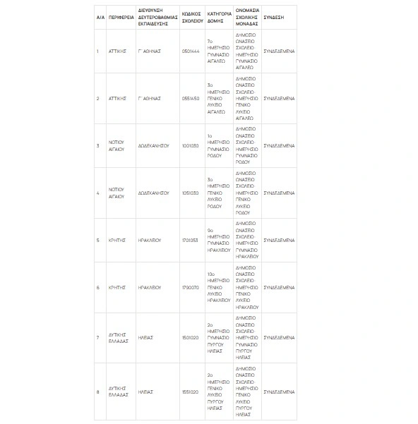 Οι 8 σχολικές μονάδες οι οποίες θα λειτουργήσουν από το σχολικό έτος 2026-2027 ως ΔΗΜ.Ω.Σ., καθώς και η μεταξύ τους σύνδεση σύμφωνα με την Υ.Α. (167401/Δ6/23-12-2025), παρουσιάζονται στον παρακάτω πίνακα: