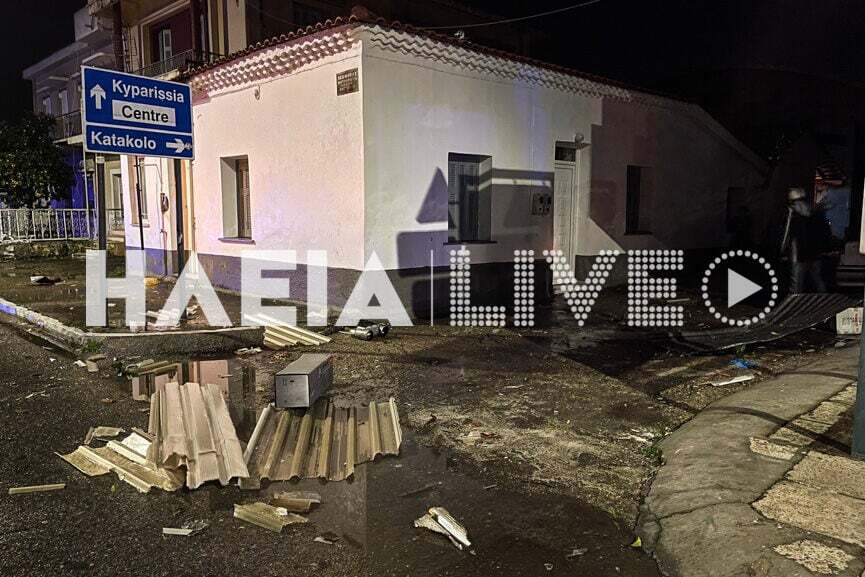 Τα τμήματα της στέγης σκόρπισαν σε μεγάλη απόσταση και προκάλεσαν ζημιές στην οδό Πατρών, όπου έπεσαν και μεταλλικά τμήματα από τη στέγη δύο κτιρίων δίπλα από το ΚΤΕΛ. Εκεί κόπηκαν καλώδια της ΔΕΔΔΗΕ και προκλήθηκε διακοπή ηλεκτροδότησης στην ευρύτερη περιοχή.