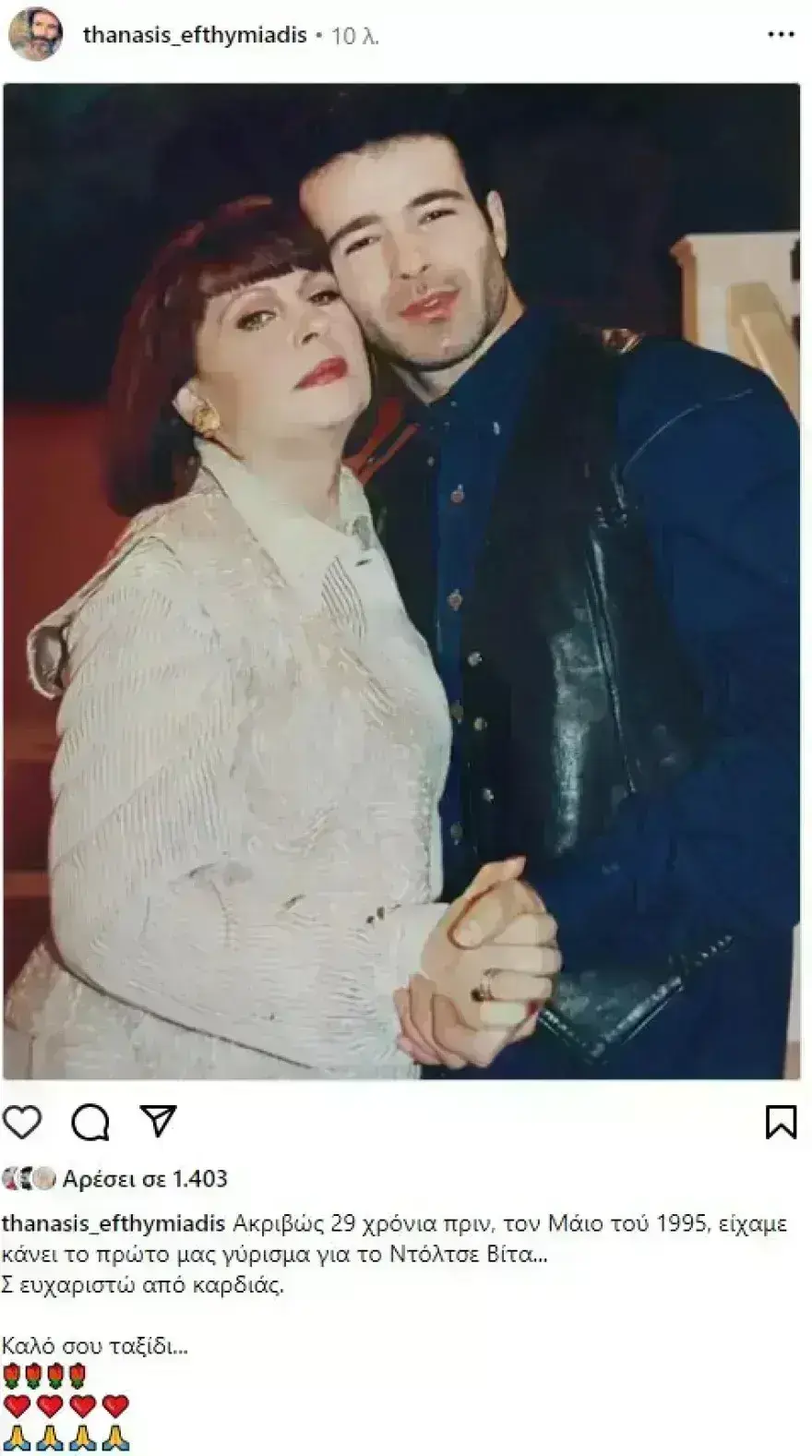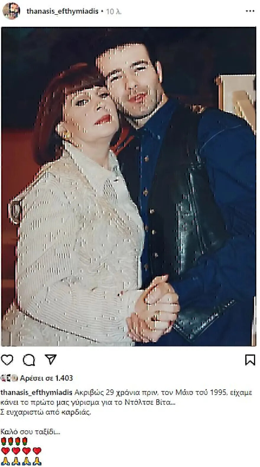 Με μια φωτογραφία τους από τα γυρίσματα τηςς επιτυχημένης σειράς του MEGA, «Dolce Vita» που τραβήχτηκε 29 χρόνια πριν, ο ηθοποιός είπε το δικό του αντίο στο άλλοτε τηλεοπτικό του ταίρι, γράφοντας: «Ακριβώς 29 χρόνια πριν, τον Μάιο τού 1995, είχαμε κάνει το πρώτο μας γύρισμα για το Ντόλτσε Βίτα.. Σ’ ευχαριστώ από καρδιάς. Καλό σου ταξίδι».