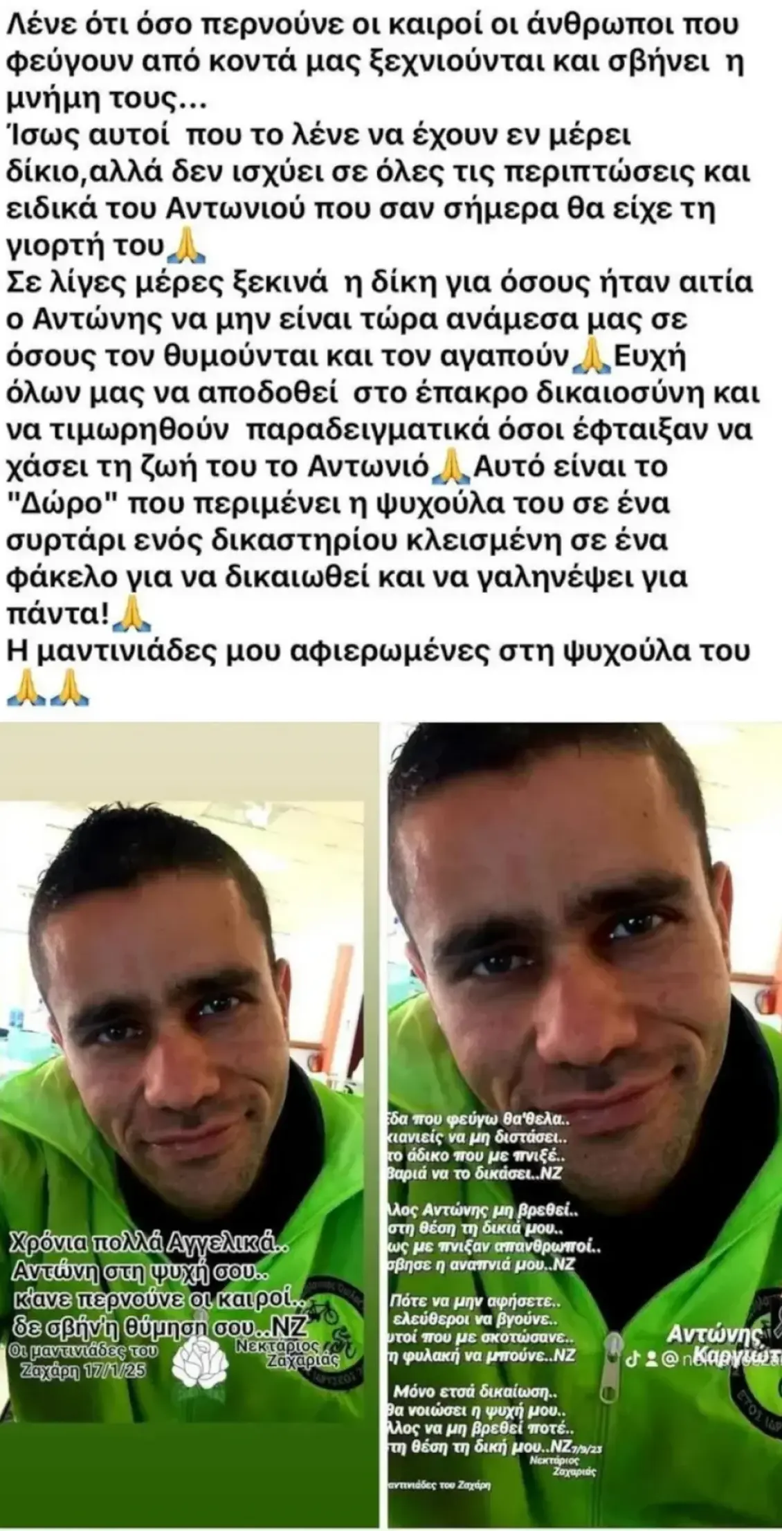 «Λένε ότι όσο περνούνε οι καιροί οι άνθρωποι που φεύγουν από κοντά μας ξεχνιούνται και σβήνει η μνήμη τους… Ίσως αυτοί που το λένε να έχουν εν μέρει δίκιο, αλλά δεν ισχύει σε όλες τις περιπτώσεις και ειδικά του Αντωνιου που σαν σήμερα θα είχε τη γιορτή του. Σε λίγες ημέρες ξεκινά η δίκη για όσους ήταν αιτία ο Αντώνης να μην είναι τώρα ανάμεσα μας σε όσους τον θυμούνται και τον αγαπούν. Ευχή όλων μας να αποδοθεί στο έπακρο δικαιοσύνη και να τιμωρηθούν παραδειγματικά όσοι εφταιξαν να χάσει τη ζωή του το Αντωνιό. Αυτό είναι το Δώρο που περιμένει η ψυχούλα του σε ένα συρτάρι ενός δικαστηρίου κλεισμένη σε ένα φάκελο για να δικαιωθεί και να γαληνέψει για πάντα! Η μαντινάδα μου αφιερωμένη στη ψυχούλα του» αναφέρει συγκεκριμένα.