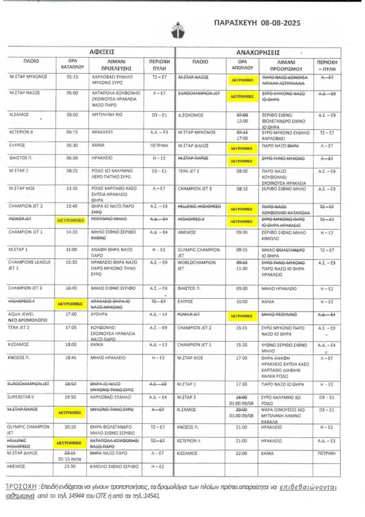 Εφόσον οι καιρικές συνθήκες βελτιωθούν, τα δρομολόγια του πλοίου από την Παρασκευή 08/08/2025 έως και τη Τρίτη 12/08/2025 (άφιξη Πειραιά) θα διαμορφωθούν σύμφωνα με τον παρακάτω πίνακα και κατόπιν ως εγκεκριμένα.