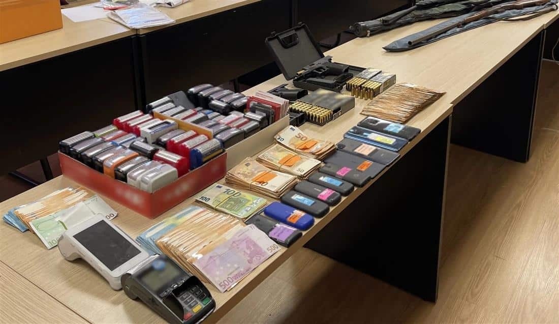 Κατά τις σωματικές έρευνες και τις έρευνες που πραγματοποιήθηκαν σε οικίες και επιχειρήσεις συνολικά βρέθηκαν και κατασχέθηκαν: 54.186 ευρώ, 2 πιστόλια, 2 καραμπίνες, πλήθος φυσιγγίων και γεμιστήρων, 6 μαχαίρια, σιδερογροθιά, 8 πολυτελή οχήματα, 59.989 απαγορευμένα φαρμακευτικά δισκία, 171 ηλεκτρονικά τσιγάρα και πλήθος κινητών. Επιπλέον, στο πλαίσιο της έρευνας, δεσμεύτηκαν 1.556.333,82 ευρώ από τραπεζικούς λογαριασμούς 22 επιχειρήσεων.