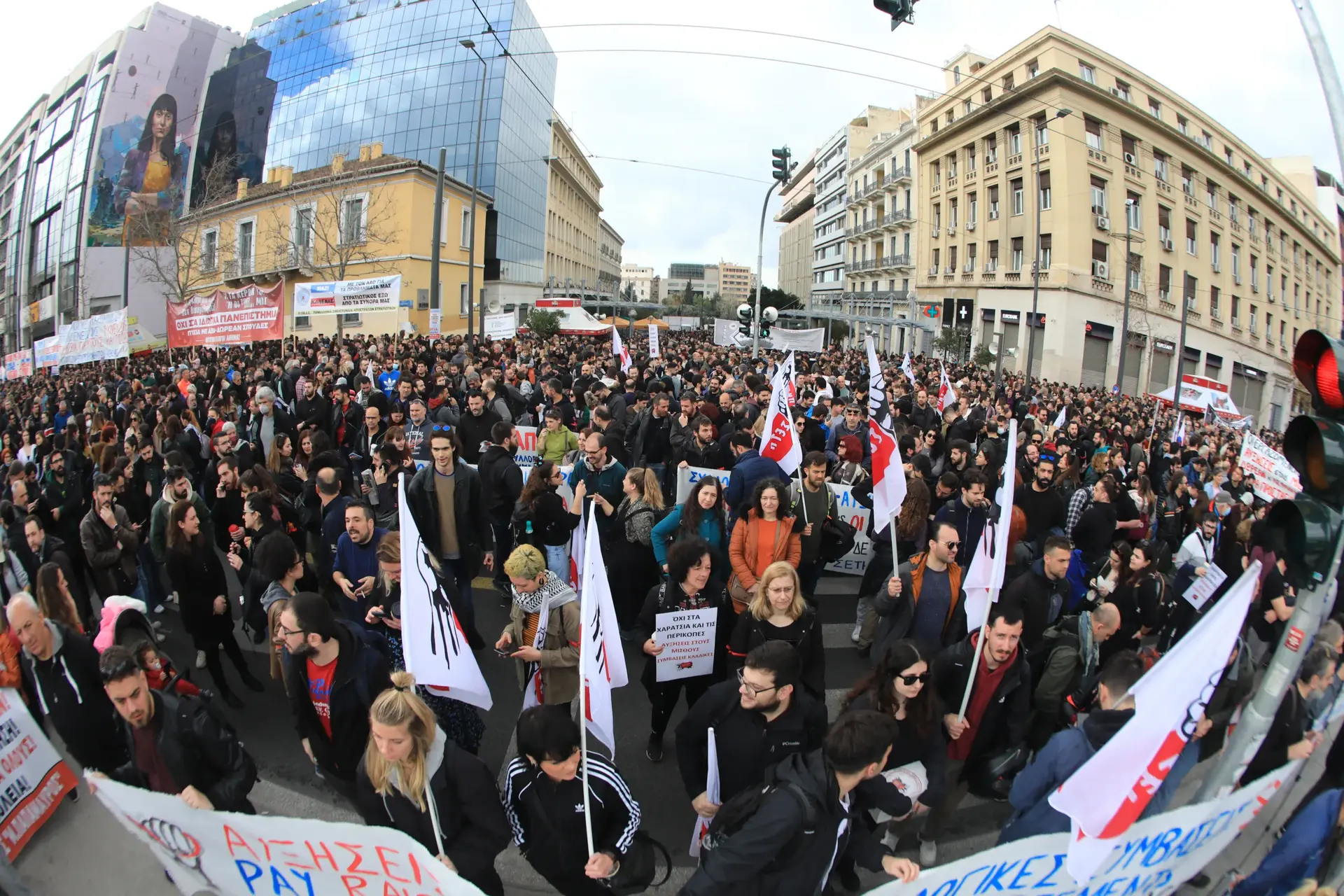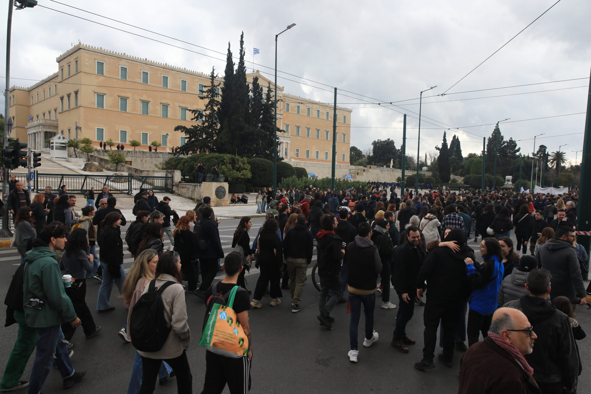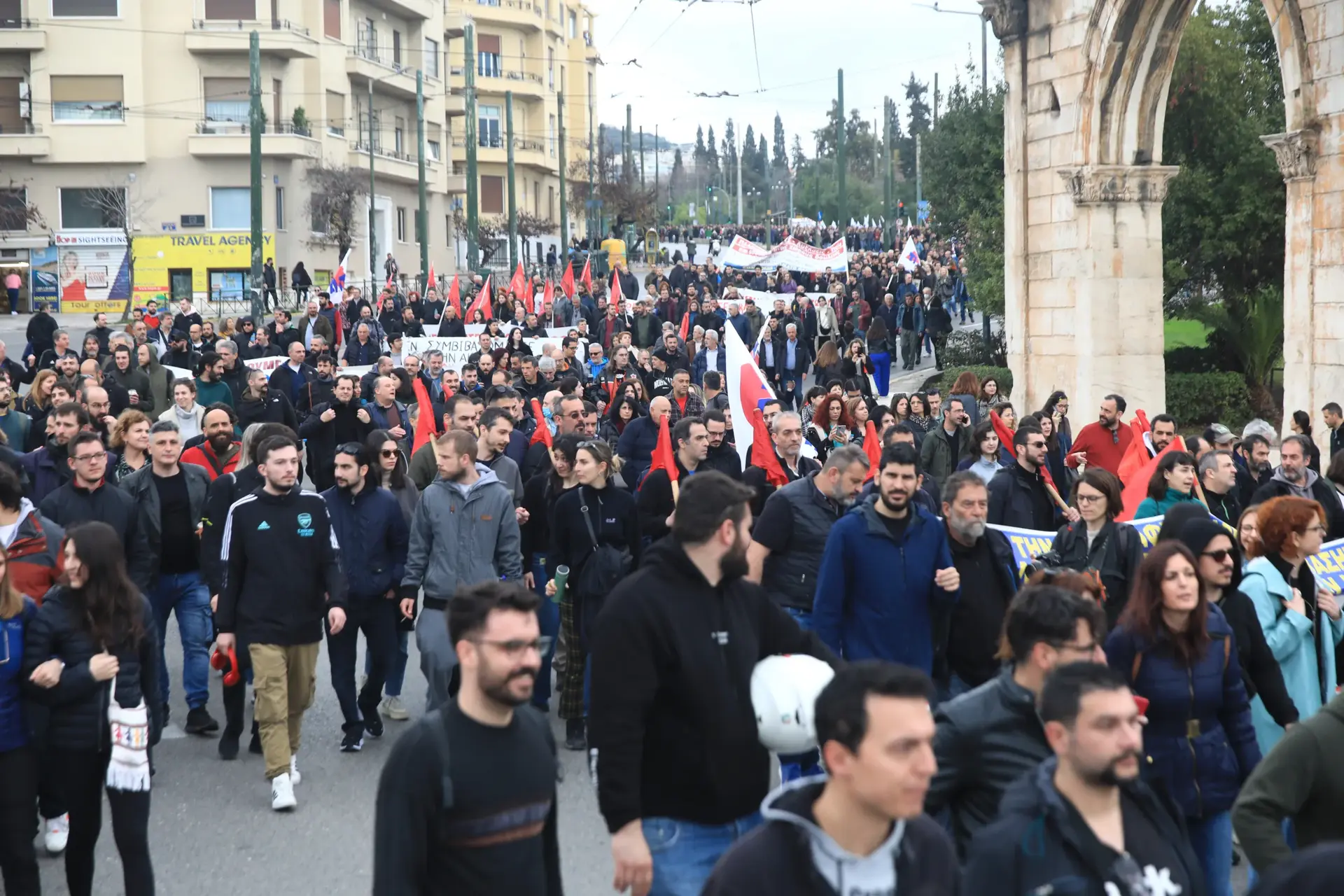 Η συγκέντρωση των Εργατικών Κέντρων-Ομοσπονδιών-Συνδικάτων στα Προπύλαια ξεκίνησε με ενός λεπτού σιγή στη μνήμη των νεκρών της τραγωδίας στα Τέμπη