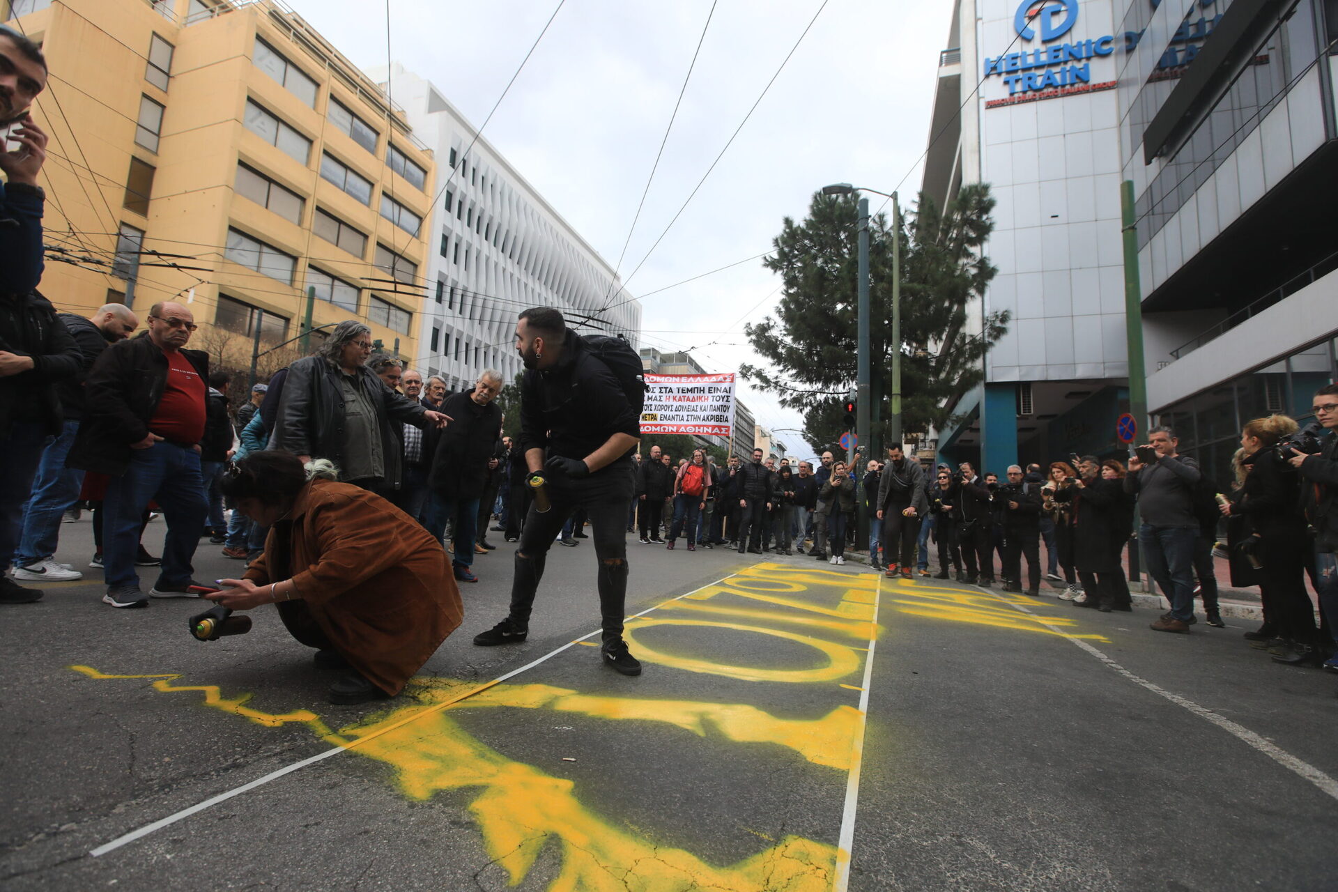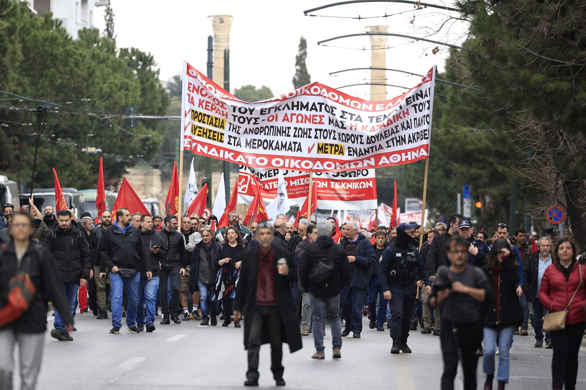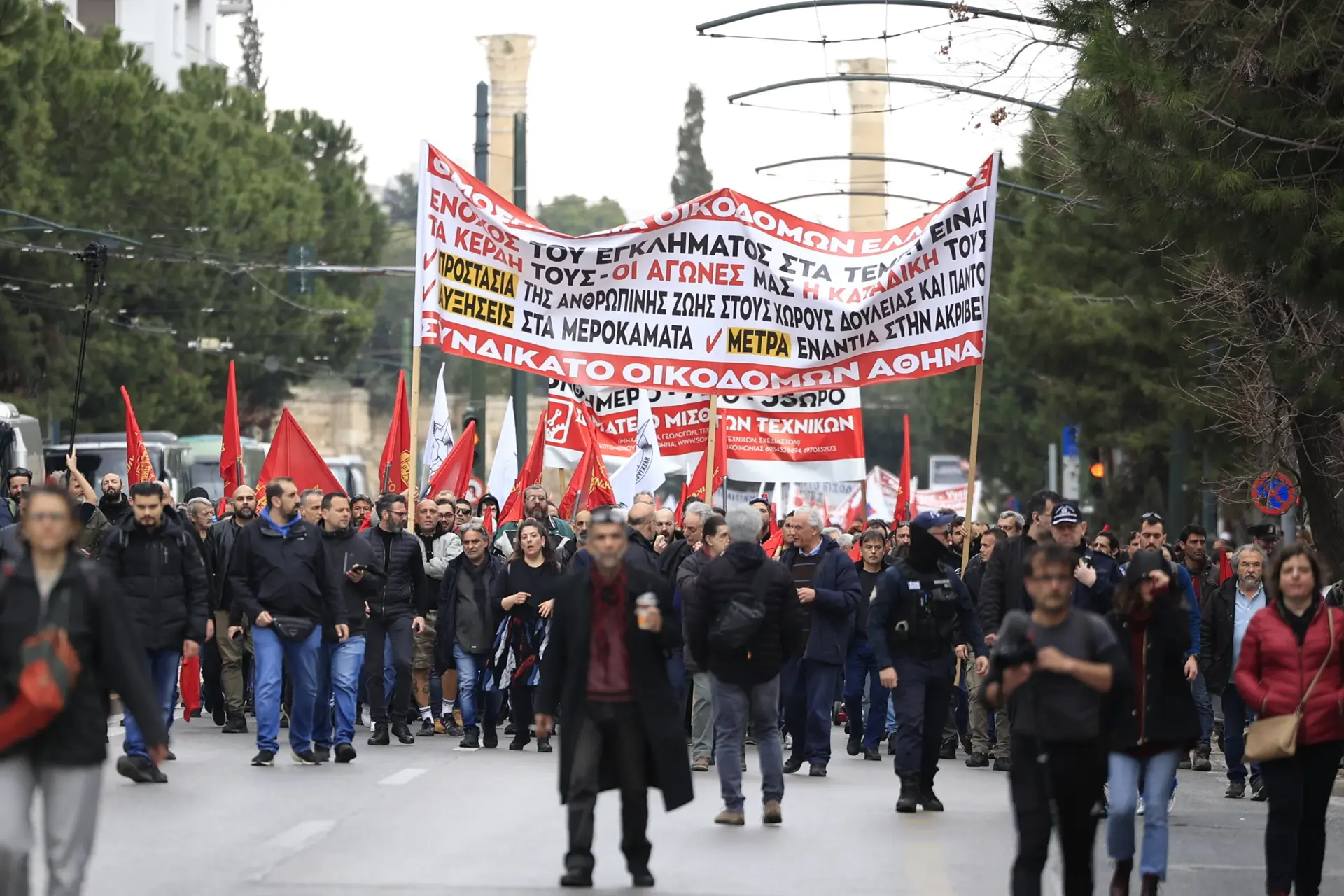 Η συγκέντρωση των Εργατικών Κέντρων-Ομοσπονδιών-Συνδικάτων στα Προπύλαια ξεκίνησε με ενός λεπτού σιγή στη μνήμη των νεκρών της τραγωδίας στα Τέμπη