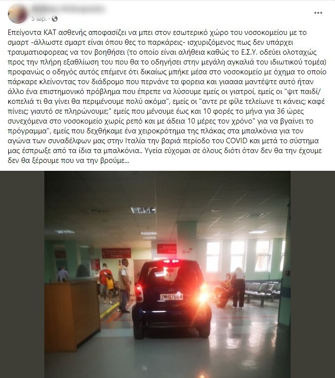“Επείγοντα ΚΑΤ ασθενής αποφασίζει να μπει στον εσωτερικό χώρο του νοσοκομείου με το σμαρτ -άλλωστε σμαρτ είναι όπου θες το παρκάρεις- ισχυριζόμενος πως δεν υπάρχει τραυματιοφορεας να τον βοηθήσει (το οποίο είναι αλήθεια καθώς το Ε.Σ.Υ. οδεύει ολοταχώς προς την πλήρη εξαθλίωση του που θα το οδηγήσει στην μεγάλη αγκαλιά του ιδιωτικού τομέα) προφανώς ο οδηγός αυτός επέμενε ότι δικαίως μπήκε μέσα στο νοσοκομείο με όχημα το οποίο πάρκαρε κλείνοντας τον διάδρομο που περνάνε τα φορεια και γιαααα μαντέψτε αυτό ήταν άλλο ένα επιστημονικό πρόβλημα που έπρεπε να λύσουμε εμείς οι γιατροί, εμείς οι “ψιτ παιδί/κοπελιά τι θα γίνει θα περιμένουμε πολύ ακόμα”, εμείς οι “αντε ρε φίλε τελείωνε τι κάνεις; καφέ πίνεις; γιαυτό σε πληρώνουμε;” εμείς που μένουμε έως και 10 φορές το μήνα για 36 ώρες συνεχόμενα στο νοσοκομείο χωρίς ρεπό και με άδεια 10 μέρες τον χρόνο” για να βγαίνει το πρόγραμμα”, εμείς που δεχθήκαμε ένα χειροκρότημα της πλάκας στα μπαλκόνια για τον αγώνα των συναδέλφων μας στην Ιταλία την βαριά περίοδο του COVID και μετά το σύστημα μας έσπρωξε από τα ίδια τα μπαλκόνια.. Υγεία εύχομαι σε όλους διότι όταν δεν θα την έχουμε δεν θα ξέρουμε που να την βρούμε…“.