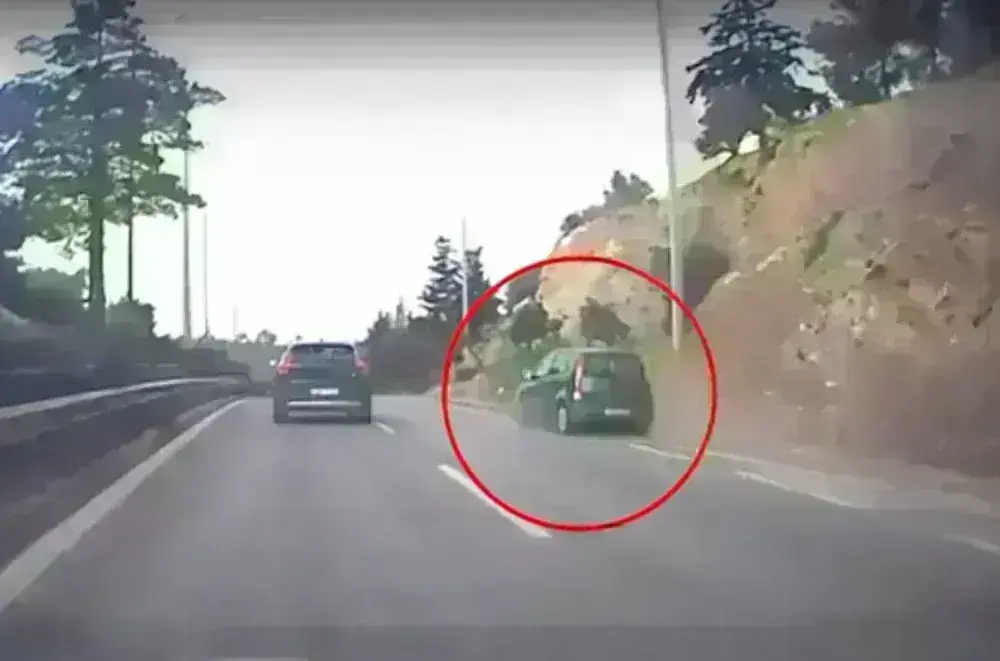 Για πάνω από ένα λεπτό, το όχημα ακουμπάει στο πεζοδρόμιο και οι ζάντες του καταστρέφονται. Ο κίνδυνος για ένα σοβαρότατο ατύχημα στο σημείο είναι διαρκής και κάνει ορισμένους από τους οδηγούς που ακολουθούν να αφήνουν απόσταση ασφαλείας