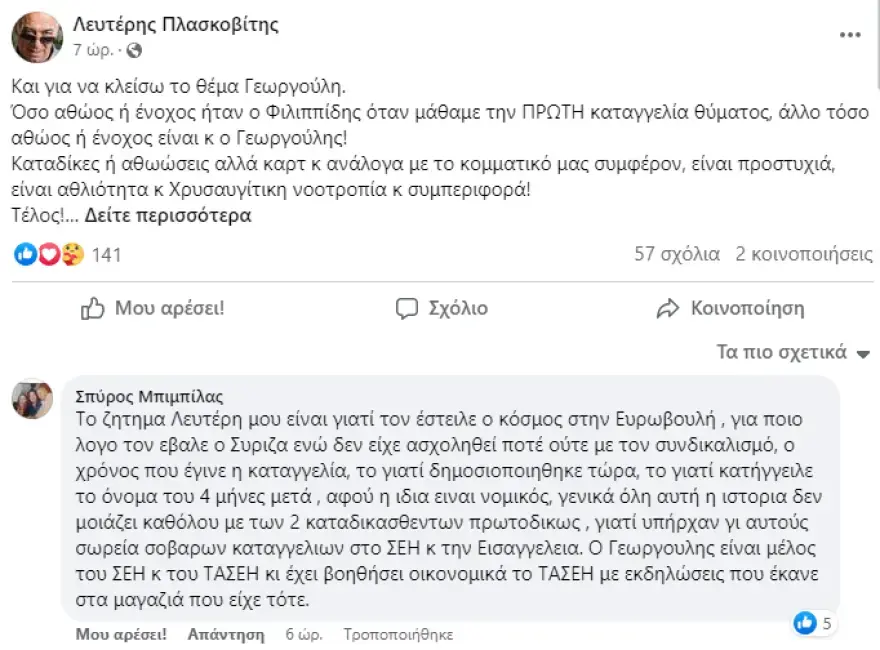 Ο κ. Πλασκοβίτης που μεταξύ άλλων είναι και στέλεχος του ΠΑΣΟΚ – ΚΙΝΑΛ έγραψε χαρακτηριστικά πως «όσο αθώος ή ένοχος ήταν ο Φιλιππίδης όταν μάθαμε την ΠΡΩΤΗ καταγγελία θύματος, άλλο τόσο αθώος ή ένοχος είναι κ ο Γεωργούλης! Καταδίκες ή αθωώσεις αλλά καρτ κ ανάλογα με το κομματικό μας συμφέρον, είναι προστυχιά, είναι αθλιότητα κ Χρυσαυγίτικη νοοτροπία κ συμπεριφορά! Τέλος! ΥΓ1 Υπήρξα κ γω πολύ ωραίος κ επιθυμητός νέος, αλλά όποτε μου έλεγε όχι κάποια γυναίκα, το χειρότερο που έκανα ήταν να λέω, «εσύ θα χάσεις» και μάλιστα με χαμόγελο. ΥΓ2 Ο Γεωργούλης είναι μέλος του ΣΕΗ;».