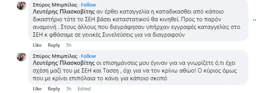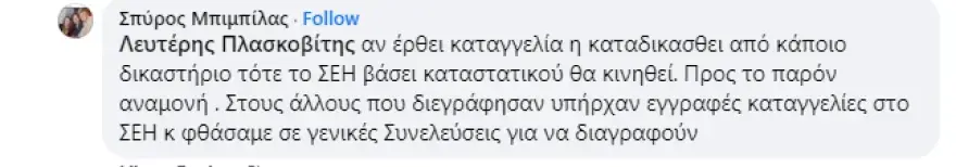 Απαντώντας εκ νέου στον Λευτέρη Πλασκοβίτη, ο Σπύρος Μπιμπίλας ανέφερε: «Αν έρθει καταγγελία η καταδικασθεί από κάποιο δικαστήριο τότε το ΣΕΗ βάσει καταστατικού θα κινηθεί. Προς το παρόν αναμονή. Στους άλλους που διεγράφησαν υπήρχαν εγγραφές καταγγελίες στο ΣΕΗ και φθάσαμε σε γενικές Συνελεύσεις για να διαγραφούν».