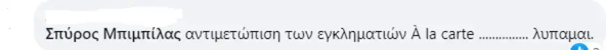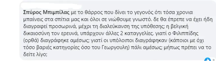 Είναι ενδεικτικό ότι το σχόλιο του κ. Μπιμπίλα προκάλεσε την έντονη αντίδραση χρηστών του facebook, που μίλησαν για «αντιμετώπιση των εγκλημάτων ‘A la carte» και ότι ο Αλέξης Γεωργούλης θα έπρεπε να έχει «διαγραφεί προσωρινά μέχρι τη διαλεύκανση της υπόθεσης».