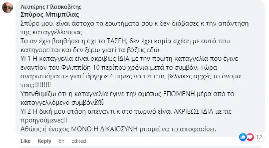Από την πλευρά του ο κ. Πλασκοβίτης απαντώντας στα λεγόμενα του προέδρου του ΣΕΗ είπε πως «είναι άστοχα τα ερωτήματά σου» και πρόσθεσε ότι «δεν διάβασες την απάντηση της καταγγέλλουσας. Το αν έχει βοηθήσει ή όχι το ΤΑΣΕΗ δεν έχει καμία σχέση με αυτά που κατηγορείται και δεν ξέρω γιατί τα βάζεις εδώ».