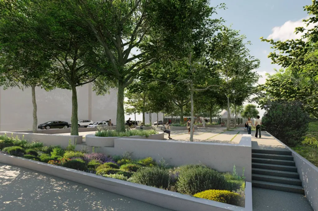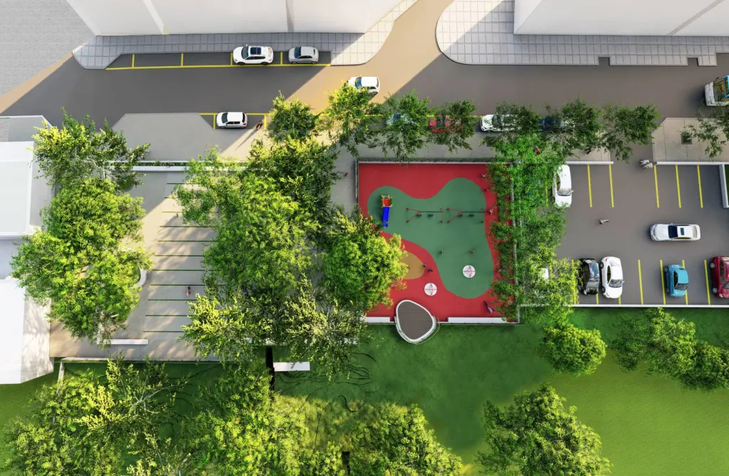 Στην πρώτη απεικόνιση, από ψηλά, διακρίνεται ένας οργανωμένος δημόσιος χώρος με σαφείς ζώνες: χώρος παιχνιδιού με σύγχρονα όργανα, δενδροφυτεμένες διαδρομές και θέσεις στάθμευσης περιμετρικά. Στη δεύτερη εικόνα, η προοπτική από το επίπεδο του εδάφους αναδεικνύει έναν ήπιο, φιλικό προς τον πεζό σχεδιασμό, με σκιά από ώριμα δέντρα, καθιστικά και διαμορφωμένα παρτέρια, που δημιουργούν έναν χώρο καθημερινής συνάντησης και ξεκούρασης για κατοίκους και επισκέπτες.