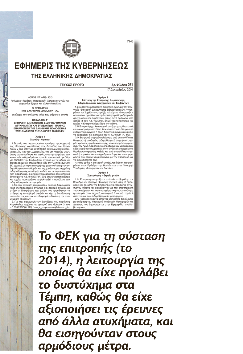 Η σύσταση της επιτροπής αυτής προβλέφθηκε με νόμο το 2014 (ν.4313/14) αλλά δεν συγκροτήθηκε ποτέ! Αντικείμενό της όπως περιγράφεται στο νόμο που δημοσιεύει ο «Ε.Τ.» είναι όχι μόνον να διερευνά τα σοβαρά σιδηροδρομικά ατυχήματα αλλά να αποφασίζει για τα μέτρα που πρέπει να ληφθούν, προκειμένου να αποφευχθούν ατυχήματα στο μέλλον.