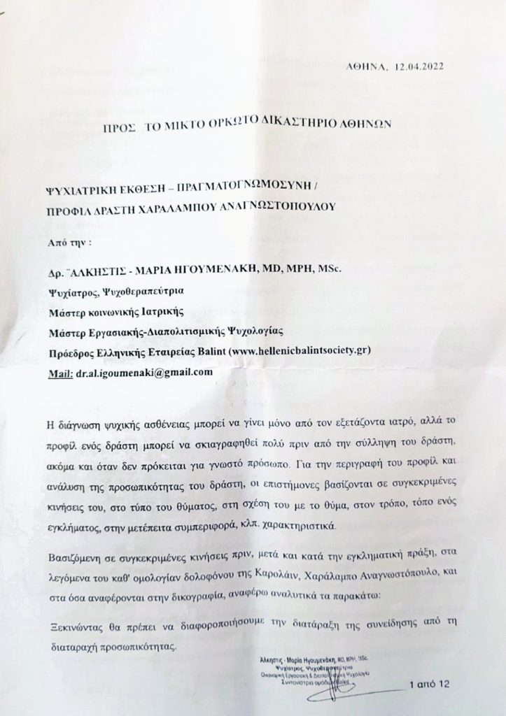 Για την κίνησή του να τοποθετήσει το παιδί δίπλα στο σώμα της νεκρής Καρολάιν, η ψυχίατρος εκτιμά πως «το παιδί θα κουβαλάει μέσα του το τραύμα αυτό και απευχόμαστε τη δημιουργία αγχωτικής διαταραχής στο μέλλον». Η ίδια επισημαίνει πως η κακοποίηση ζώων συνδέεται άμεσα με την κακοποιητική συμπεριφορά σε ανθρώπους και καταλήγει: «Ο δράστης θα γίνεται και μελλοντικά με ευκολία κακοποιητικός με διάφορους τρόπους. Ατομα σαν αυτόν οργανώνουν ακόμα και μέσα στη φυλακή τα επόμενα βήματά τους, ώστε να φτάσουν στον σκοπό τους, ο οποίος στην περίπτωση του κατηγορουμένου θα είναι να ελευθερωθεί σύντομα και να πάρει την κόρη του, όπως ήθελε να γίνει με τη διάπραξη του εγκλήματος. Θα δείξει καλή συμπεριφορά στη φυλακή και πάντα θα δικαιολογεί την πράξη του ενοχοποιώντας το θύμα».