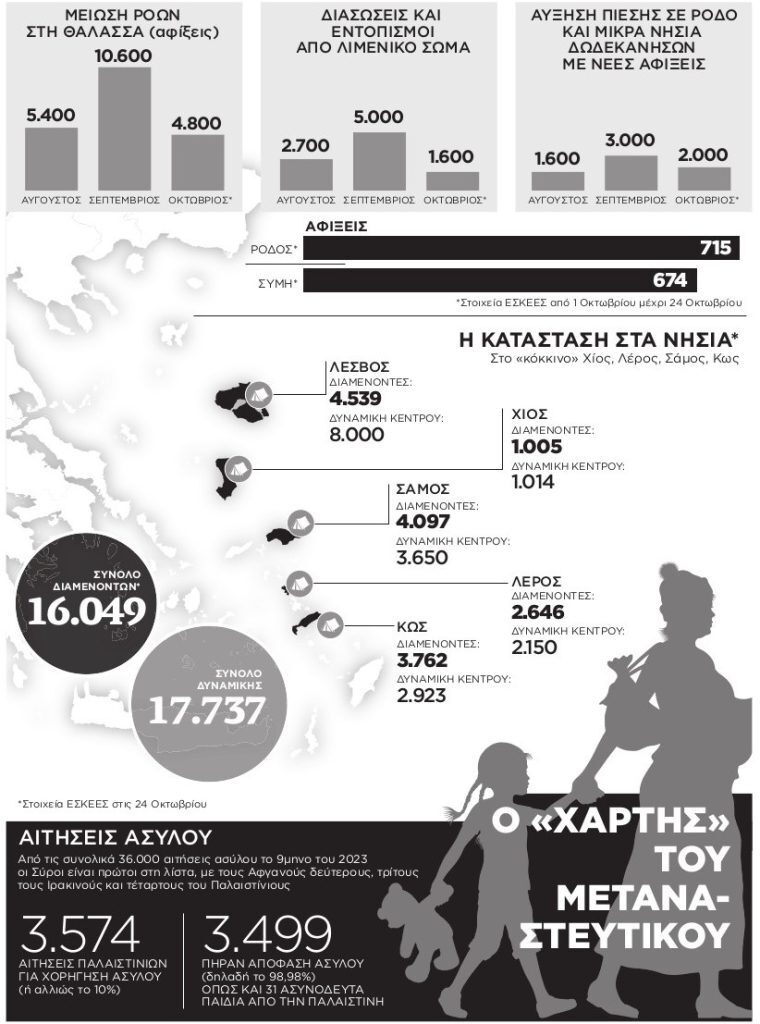 Οι ροές τον Οκτώβριο ήταν εμφανώς μειωμένες. Το Λιμενικό Σώμα διέσωσε ή εντόπισε 1.654 (μέχρι και τις 24/10) όταν τον Σεπτέμβριο οι διασώσεις ξεπερνούσαν τις 5.000. Αντίστοιχα οι συνολικές αφίξεις (και όσοι δηλαδή μετανάστες έφτασαν μόνοι τους στα Κέντρα ή τους εντόπισε η ΕΛ.ΑΣ. και σχημάτισε τη δικογραφία) ήταν περίπου 10.000 τον Σεπτέμβρη, ενώ σύμφωνα με εκτιμήσεις τον Οκτώβρη θα αγγίξουν τις 5.000, μια μείωση 50%.