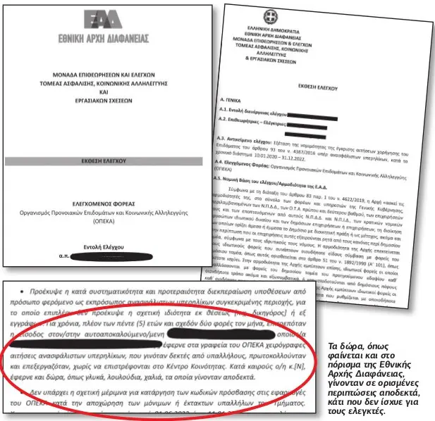 Σε άλλο σημείο του πορίσματος αναφέρεται ότι πήγαιναν στον οργανισμό «εκπρόσωποι» των δήθεν δικαιούχων με γλυκά, λουλούδια και άλλα δώρα στους υπαλλήλους, προφανώς για να τους επηρεάσουν θετικά για την έγκριση των αιτήσεων. Ιδού τι αναφέρει το πόρισμα για τα πρόσωπα που μεσολαβούσαν για τα επιδόματα: «Κατόπιν των τηλεφωνικών επικοινωνιών με τους αιτούντες, στις 8.2.2024, επισκέφθηκε τα γραφεία των εσωτερικών ελεγκτών/τριών ο/η [Ν.Τ.], ο/η οποίος/α συστήθηκε ως πρόεδρος των Ρομά και δήλωσε, μεταξύ άλλων, ότι μαζί με έναν/μία λογιστή/τρια, βοηθά τους συμπολίτες του/της στην συμπλήρωση των αιτήσεων. Εδειξε δε στον/στην [Α.Δ.], μία ατζέντα όπου ήταν καταχωρημένα ονόματα υπαλλήλων του ΟΠΕΚΑ ([Α.Χ.], [Ε.Τ.], [Ε.Κ.], [Β.], [Τ.]) και κινητά τηλέφωνα. Ηταν επίσης «φορτωμένος/μένη με δώρα», τα οποία δεν έγιναν αποδεκτά. Η προσέλευση του παραπάνω προσώπου στα γραφεία του 4ου ορόφου του ΟΠΕΚΑ επιβεβαιώθηκε από τις συνεντεύξεις του/της [Ε.Τ.], του/της [Γ.Φ.] και του/της [Α.Τ.], σύμφωνα με τις οποίες, λάμβανε χώρα τουλάχιστον δύο φορές τον μήνα, για χρονικό διάστημα πέραν των πέντε ετών, προσκομίζοντας χειρόγραφες αιτήσεις ή συμπληρωματικά δικαιολογητικά, τις περισσότερες φορές χωρίς εξουσιοδοτήσεις. Συχνά δε έφερνε λουλούδια, γλυκά ή χαλιά.