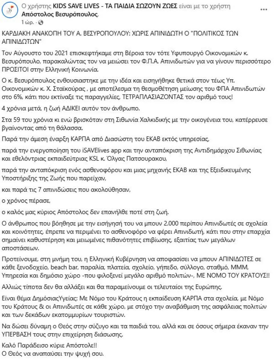Ολόκληρη η ανάρτηση της ΜΚΟ «Kids Save Lives-Τα Παιδιά Σώζουν Ζωές» για τον θάνατο του Απόστολου Βεσυρόπουλου