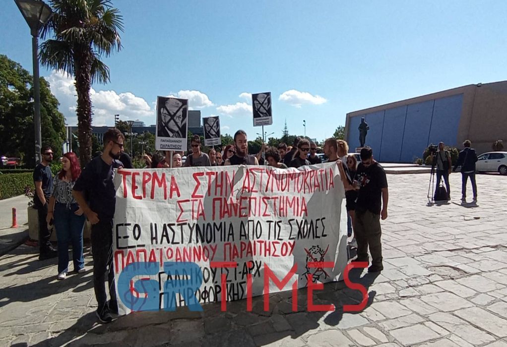 Κρατώντας πανό και φωνάζοντας συνθήματα, για άλλη μια μέρα μέλη φοιτητικών συλλόγων και φοιτητές που πρόσκεινται στα φοιτητικά σχήματα της Ενιαίας Ανεξάρτητης Αριστερής Κίνησης (ΕΑΑΚ), συγκεντρώθηκαν το μεσημέρι της Πέμπτης (29/9) στην Πρυτανεία του ΑΠΘ, με σκοπό να δηλώσουν εκ νέου την εναντίωση τους στην πανεπιστημιακή αστυνομία.