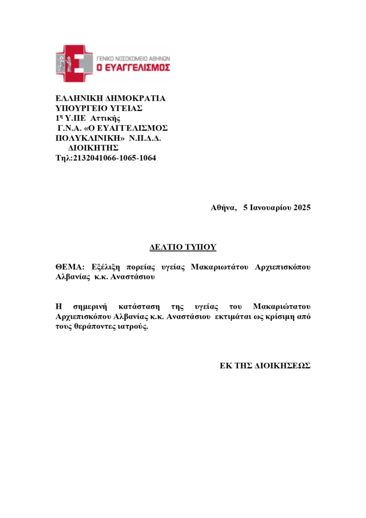 Όπως αναφέρει το ιατρικό ανακοινωθέν του Ευαγγελισμού που εκδόθηκε: «Η σημερινή κατάσταση της υγείας του Μακαριώτατου Αρχιεπισκόπου Αλβανίας κ.κ. Αναστάσιου εκτιμάται ως κρίσιμη από τους θεράποντες ιατρούς».