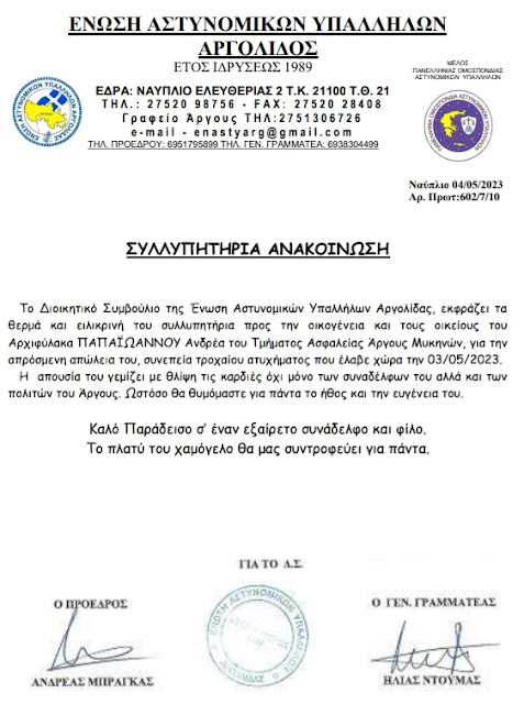 «Το Διοικητικό Συμβούλιο της Ένωση Αστυνομικών Υπαλλήλων Αργολίδας, εκφράζει τα θερμά και ειλικρινή του συλλυπητήρια προς την οικογένεια και τους οικείους του Αρχιφύλακα ΠΑΠΑΪΩΑΝΝΟΥ Ανδρέα του Τμήματος Ασφαλείας Άργους Μυκηνών, για την απρόσμενη απώλεια του, συνεπεία τροχαίου ατυχήματος που έλαβε χώρα την 03/05/2023.