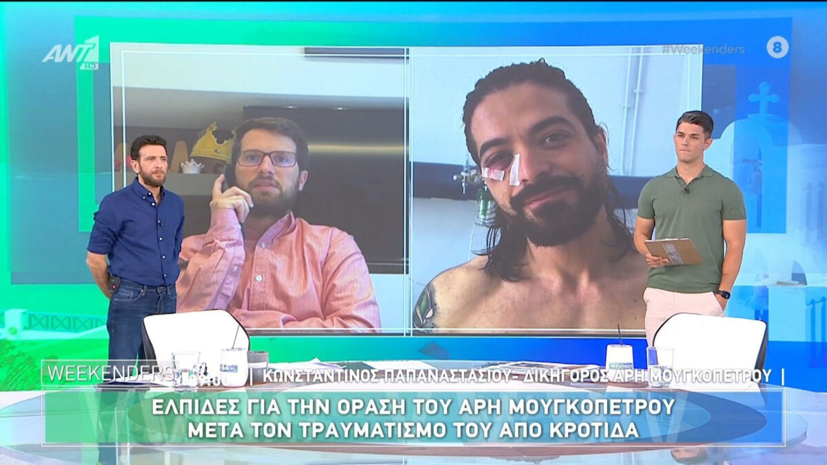 Η Ματίνα Παγώνη μίλησε στην τηλεόραση του Alpha για την εξέλιξη της υγείας του και τόνισε πως είναι λογικό να υπάρχει πρόβλημα στην όρασή του. Σημείωσε ωστόσο, πως δεν υπήρχε αποκόλληση, αλλά μικρές αιμορραγίες λόγω του τραυματισμού. Επιπλέον, ανέφερε πως ο Άρης Μουγκοπέτρος υποβλήθηκε σε επέμβαση συγκόλλησης των δακτύλων του, με τους γιατρούς να αναμένουν δύο με τρία 24ωρα για να δουν πώς θα εξελιχθεί η κατάσταση.