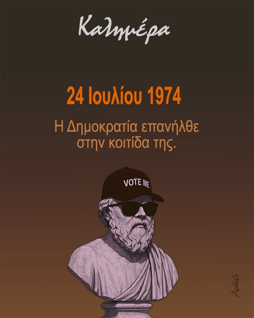 Αιχμηρή και πολιτική είναι η Καλημέρα του Αρκά, σήμερα, 24 Ιουλίου 2025 με τον σκιτσογράφο να αποτυπώνει σε σκούρο φόντο τον Σωκράτη με μαύρα γυαλιά και καπέλο τζόκεϊ που πάνω γράφει «vote me» και τη λεζάντα «Η Δημοκρατία επανήλθε στην κοιτίδα της».