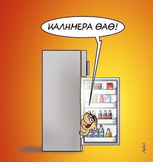 Στο σημερινό του σκίτσο, απεικονίζεται ο Θανασάκης να βγαίνει από το ψυγείο προκειμένου να δροσιστεί, εν μέσω καύσωνα.
