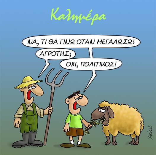 Με το σκίτσο… καρφί, δείχνει έναν αγρότη που το παιδί του ταΐζει ένα πρόβατο. Ο νεαρός την ώρα που δίνει το σανό στο πρόβατο αποφασίζει τι θα κάνει όταν μεγάλωσει. Ο πατέρας του τον ρωτάει αν σκοπεύει να γίνει αγρότης κι εκείνος απαντά…. πολιτικός θίγοντας έτσι εμμέσως πλην σαφώς τη στάση του μέσου ψηφοφόρου που ψηφίζει.