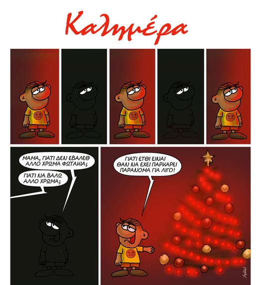 Στο νέο του σκίτσο βλέπουμε τον αγαπημένο ήρωα μικρών και μεγάλων, τον Θανασάκη, να κάθεται μπροστά από το χριστουγεννιάτικο δέντρο και να έχει «κόκκινες» απορίες. Ο μικρός αναρωτιέται γιατί η μαμά του δεν έβαλε άλλο χρώμα στα φωτάκια αφού έτσι μοιάζει σα να έχει παρκάρει παράνομα για λίγο!