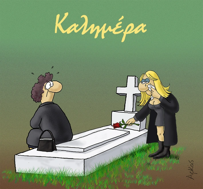 Στο σκίτσο παρουσιάζει μια μαυροφορεμένη γυναίκα σε πράσινο φόντο να έχει επισκεφθεί το νεκροταφείο. Μπορεί η σύζυγος να κάθεται βαρυπενθούσα στο πλευρό του εκλιπώντος αλλά δεν είναι μόνη στο νεκροταφείο αλλά και στον τάφο ειδικότερα.
