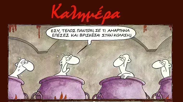 Ο γνωστός σκιτσογράφος στο σημερινό του σκίτσο, μας μεταφέρει στην κόλαση όπου τα καζανία με τις ψυχές βράζουν αλλά ένας μάλλον την γλίτωσε.