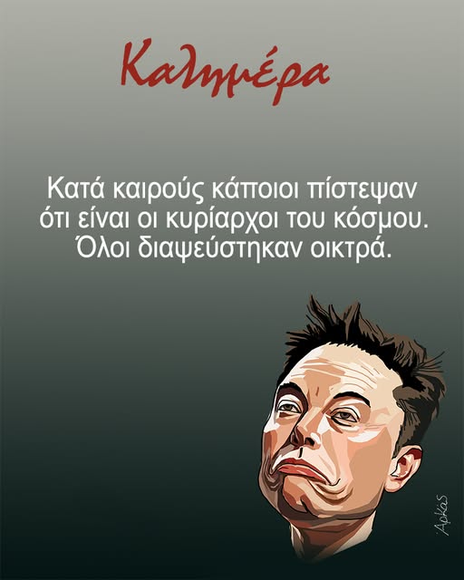 Στο σκίτσο εμφανίζεται ο δισεκατομμυριούχος Έλον Μασκ και σε γκρι φόντο υπάρχει η λεζάντα που γράφει «Κατά καιρούς κάποιοι πίστεψαν ότι είναι κυρίαρχοι του κόσμου. Διαψεύστηκαν οικτρά».