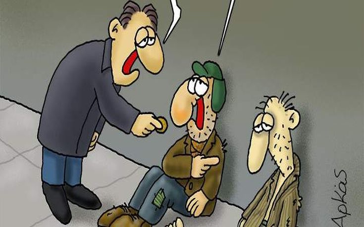 Με το καυστικό χιούμορ του αποτυπώνει έναν καλοντυμένο κύριο να πλησιάζει δυο φτωχούς, ανθρώπους και δίνει σε έναν από αυτούς ένα κέρμα με την προτροπή: «πάρε φτωχέ μου άνθρωπε να κάνεις Χριστούγεννα»!